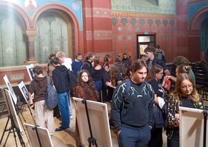 Nachdem bereits im April 2022 die Seliger-Gemeinde mit Thomas Oellermann, Historiker und Präsidiumsmitglied, die Ausstellung „Böhmen liegt nicht am Meer – Lebenswege sudetendeutscher Sozialdemokraten“ am Gymnasium in Teplitz/Teplice zeigen konnte, freute es die Verantwortlichen, dass auch die Ausstellung „GHT – frühe Werke von Georg Hans Trapp des Zeichners von Flossenbürg“ diese Woche im Vortragssaal des Gymnasiums präsentiert werden konnte. Auch hierzu erhielten die Oberstufenschülerinnen und -schüler eine historische Einführung in das Zeitgeschehen und die Person Georg Hans Trapp durch Thomas Oellermann.