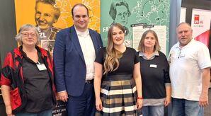 Den beiden Landesvorsitzenden Ronja Endres (Mitte) und Sebastian Roloff (2.v.li.) gratulierten am Stand der Seliger-Gemeinde Bundesgeschäftsführer Rainer Pasta (re.) sowie Barbara Kasberger (2.v.re.) und Karin Hagendorn (li.)