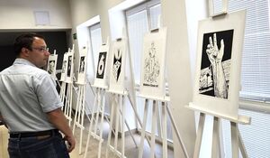 Martin Rak betrachtet nach der Ausstellungseröffnung die Grafiken von Georg Hans Trapp