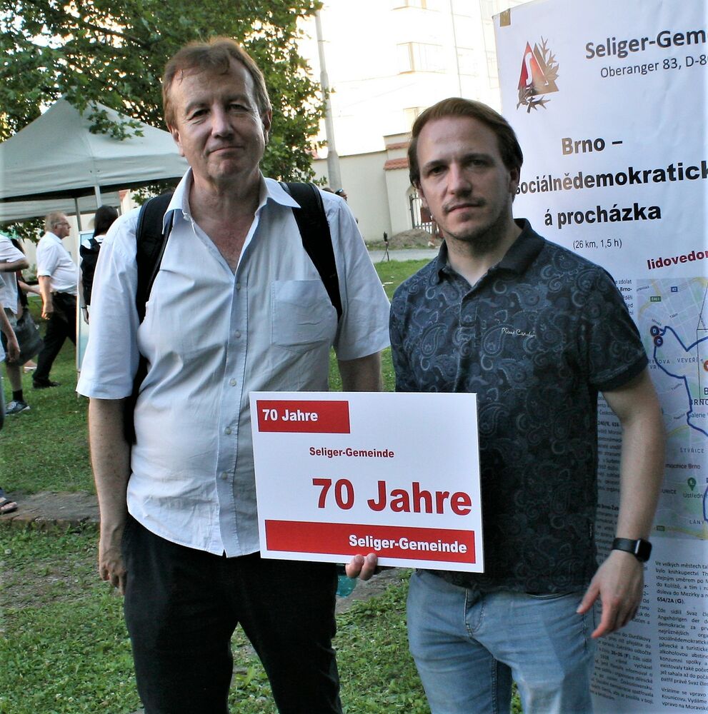 Peter Barton (li.) und Wilhelm Simeon (re), CSSD-Komunalpolitiker aus Cheb/Eger gratulieren der Seliger-Gemeinde zum 70. Geburtstag und erinnern sich an das freundschaftliche Zusammentreffen bei den Marienbader Gesprächen im Juli.