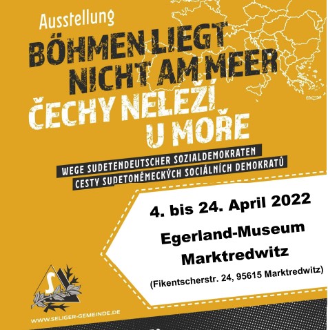 Die neue, zweisprachige Wanderausstellung der Seliger-Gemeinde ist vom 3. - 24. April 2022 im Egerland-Museumin Marktredwitz zu sehen. Unter dem Titel „Böhmen liegt nicht am Meer, aber in der Mitte Europas" - „Čechy neleží u moře, nýbrž ve středu Evropy“ - werden am Beispiel von 24 Personen die Lebensschicksale und das Wirken Sudetendeutscher Sozialdemokratinnen und Sozialdemokraten vorgestellt. Eine Homepage zur Ausstellung und ein Begleitheft mit vertiefenden Materialien ergänzen die Ausstellung. https://www.ausstellung-seliger-gemeinde.de/
