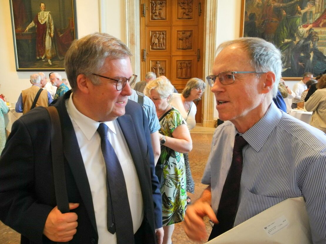 Im Gespräch am Rande der Wenzel-Jaksch-Gedächtnispreisverleihung am 3. Juli im Maximilianeum in München: George Jaksch (re.) und Volkmar Halbleib, MdL (li.). (Foto: Uli Miksch)