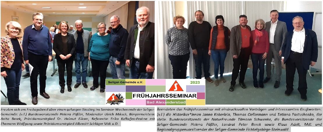 „Die Geschichte von Demokratinnen und Demokraten erzählen – Perspektiven und Chancen“, so lautete das Motto des diesjährigen Frühjahrsseminars der Seliger-Gemeinde am vergangenen Wochenende in Bad Alexandersbad. Ein interessantes Programm mit einer Bus-Exkursion ins bayerisch-tschechische Grenzgebiet lockte rund 50 Teilnehmer ins Hotel Alexandersbad. MdL Klaus Adelt, Landrat Peter Berek und Bürgermeisterin Antita Berek bereicherten die Veranstaltung mit einem Grußwort.