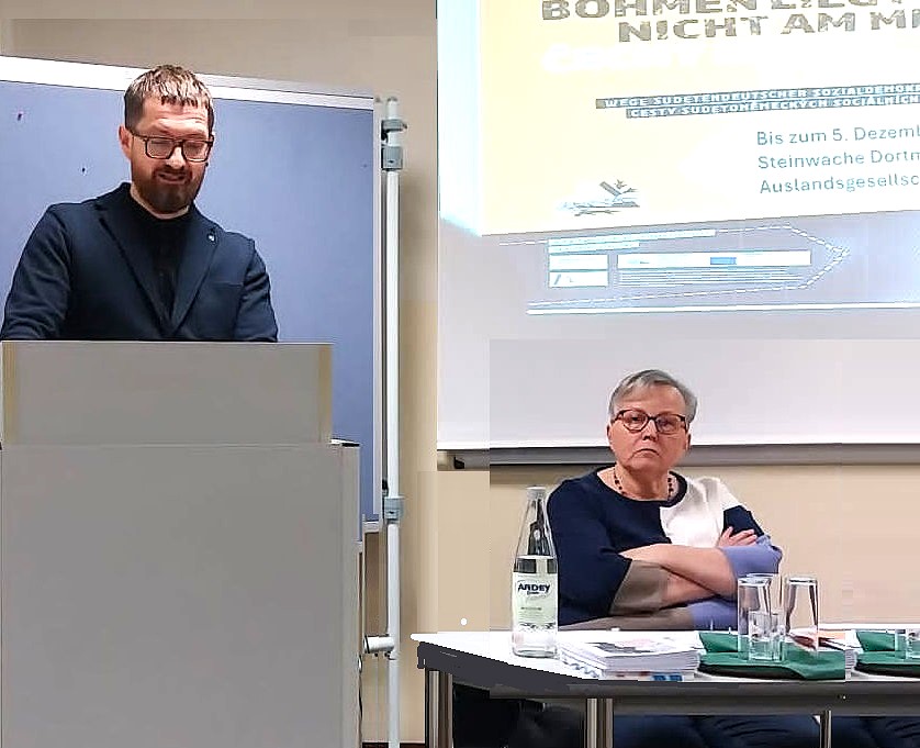 Der Leiter der „Steinwache“, Markus Günnewig (li.), begrüßt die Referentin Erika Kalkofen-Frahne (re.) sowie die Zuhörerinnen und Zuhörer zum Vortrag zur Ausstellung „Böhmen liegt nicht am Meer – Wege sudetendeutscher Sozialdemokraten“ am 5. Dezember in der Gedenkstätte „Steinwache“ in Dortmund