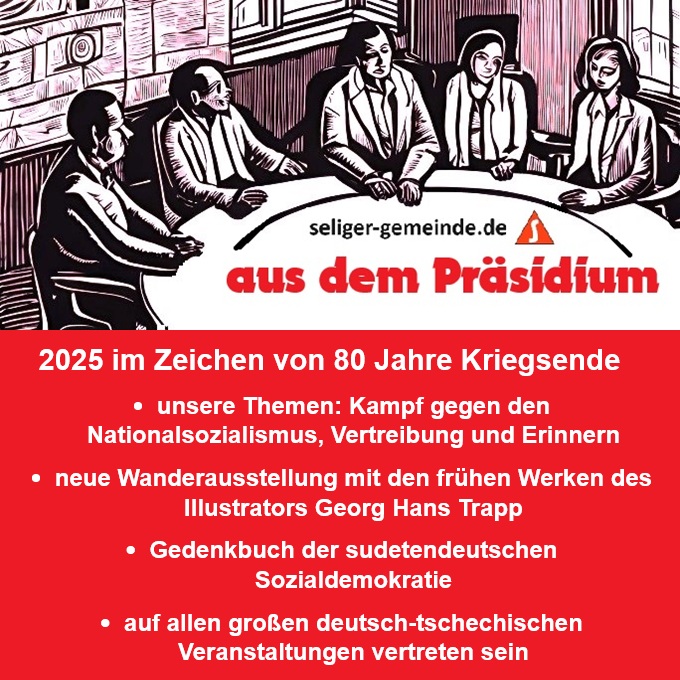 Das Präsidium der Seliger-Gemeinde hat auf seiner letzten Sitzung wichtige Beschlüsse zu ihrem Jahresprogramm gefasst. Das Jahr 2025 wird ganz im Zeichen des 80. Jahrestages des Kriegsendes stehen. Geplant sind zahlreiche Veranstaltungen, die sich mit so wichtigen Themen wie Kampf gegen den Nationalsozialismus, Vertreibung und Erinnern beschäftigen. Die Seliger-Gemeinde wird in diesem Jahr eine neue Wanderausstellung mit den frühen Werken des Illustrators Georg Hans Trapp zeigen. Sie wird darüber hinaus ein Gedenkbuch der sudetendeutschen Sozialdemokratie veröffentlichen. Sie wird vor allem aber mit ihren Themen auf allen großen deutsch-tschechischen Veranstaltungen vertreten sein.