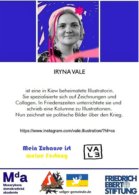 Im Rahmen des Frühjahrsseminars der Seliger-Gemeinde erfolgt die Eröffnung einer Ausstellung der ukrainischen Illustratorin Iryna Vale (Kiew) - Iryna Vale verweilte während des russischen Angriffs in der Nähe von Kiew. Sie erlebte den Angriff durch Raketen an einem vermeintlich sicheren Platz in ihrem Elternhaus. Und sie zeichnet Bilder, wie sie den Krieg erlebt.