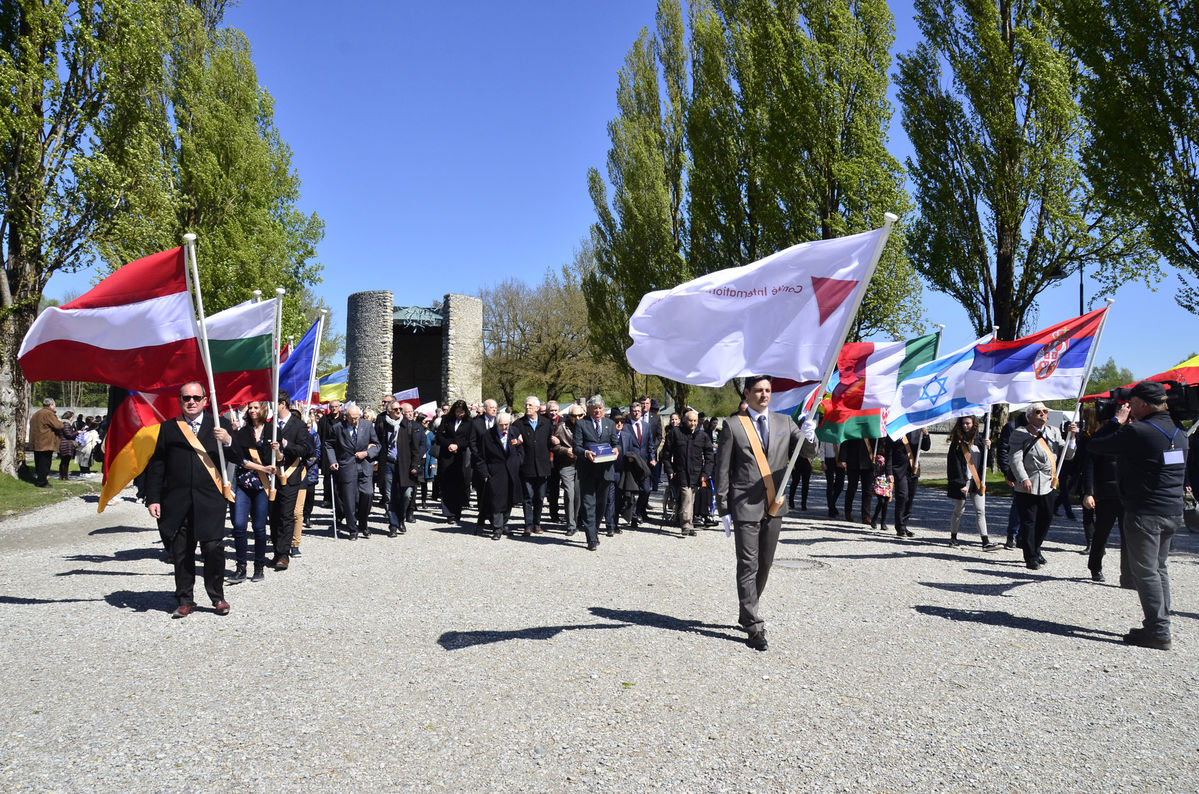 Nach der Gedenkveranstaltung vor dem ehemaligen Krematorium zogen die Besucher, allen voran Fahnenträger und Zeitzeugen, zum ehemaligen Appellplatz. Dort folgten weitere Reden. Die Veranstaltung in der KZ-Gedenkstätte endete mit den Kranzniederlegungen vor dem internationalen Mahnmal.