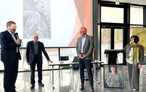 Bildübergabe Wenzel Jaksch am Heiligenhof: Der Sohn von Wenzel Jaksch, George Jaksch (2.v.re.), trug die Kosten des Bildes und reiste extra zur Übergabe an: „Es ist mir eine Ehre!“ Seliger-Bundesvorsitzende Christa Naaß (re.), Ideengeber Hans Knapek (2.v.re.) und Stiftungsdirektor Steffen Hörtler (li.) freuten sich über die gelungene Aktion