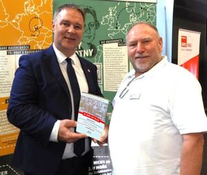 Andreas Babler (li.) SPÖ-Vorsitzender und österreichischer Vize-Kanzler besucht den Stand der Seliger-Gemeinde beim SPD-Landesparteitag in Landshut. Bundesgeschäftsführer Rainer Pasta (re.) überreicht das Gendenkbuch der Sudetendeutschen Sozialdemokratie, zu dem Andreas Babler ein Grußwort verfasst hat.